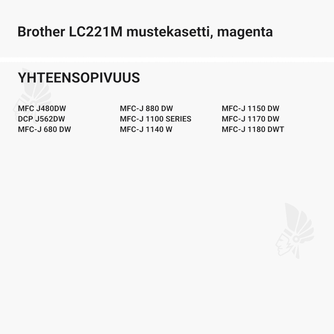 | Brother LC221M mustekasetti, magenta – tarvike, premium | 600 | Väri: | Saatavuus: | 13,90 € | KORIIN |