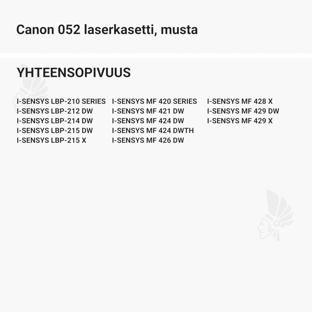 | Canon 052 laserkasetti, musta – tarvike, premium | 3100 | Väri: | Saatavuus: | 49,90 € | KORIIN |
