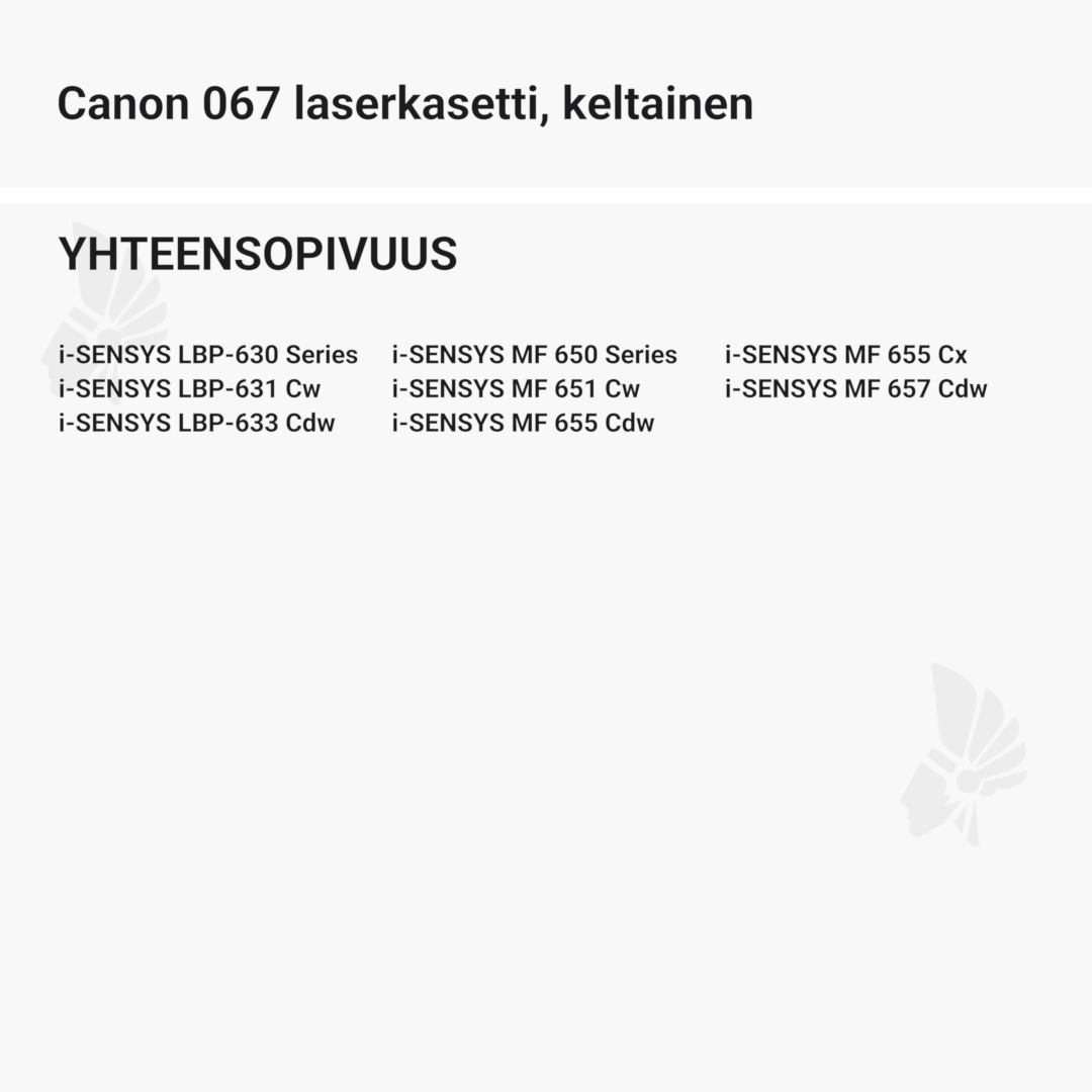 | Canon 067 laserkasetti, keltainen – tarvike, premium | 1250 | Väri: | Saatavuus: | 79,90 € | KORIIN |