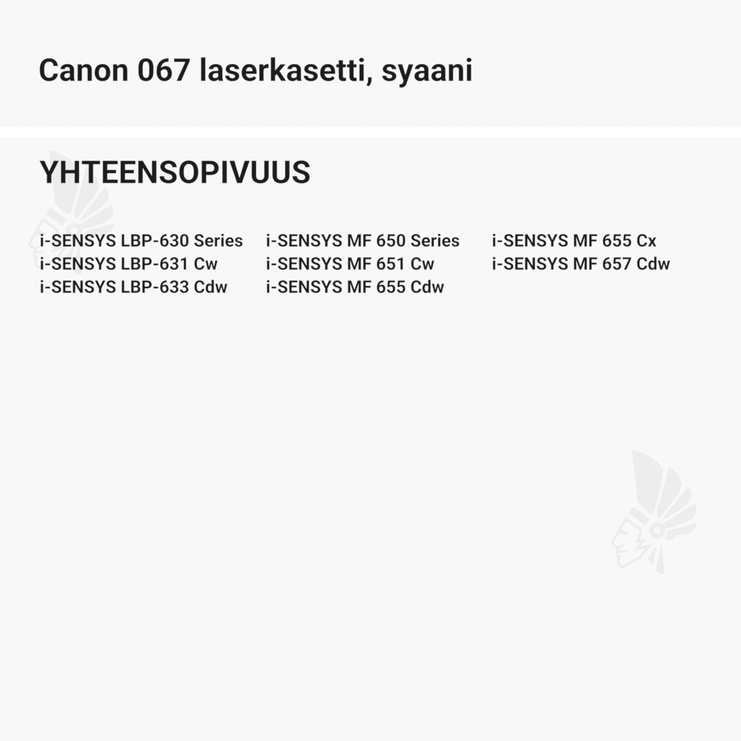 | Canon 067 laserkasetti, syaani – tarvike, premium | 1250 | Väri: | Saatavuus: | 79,90 € | KORIIN |