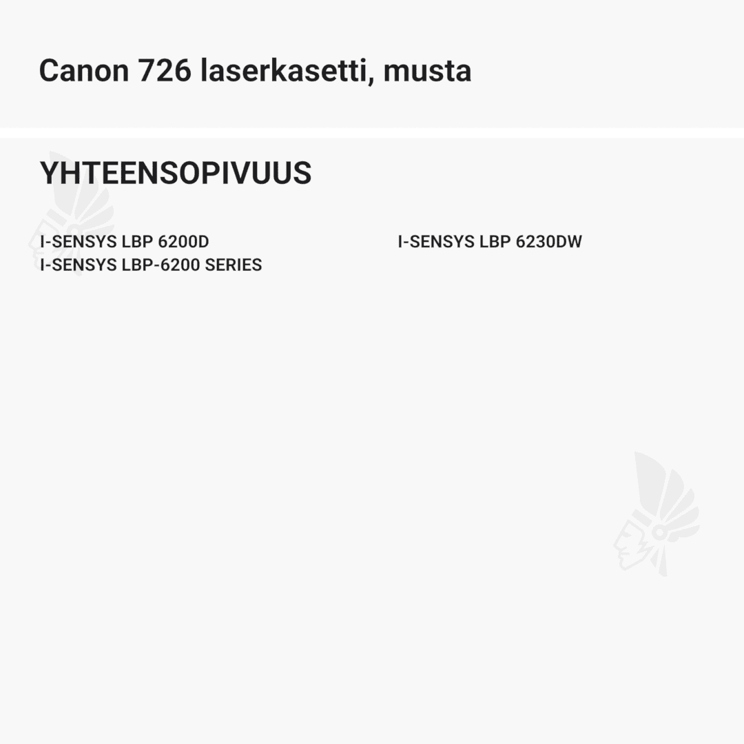 | Canon 726 laserkasetti, musta – tarvike, premium | 2100 | Väri: | Saatavuus: | 49,90 € | KORIIN |