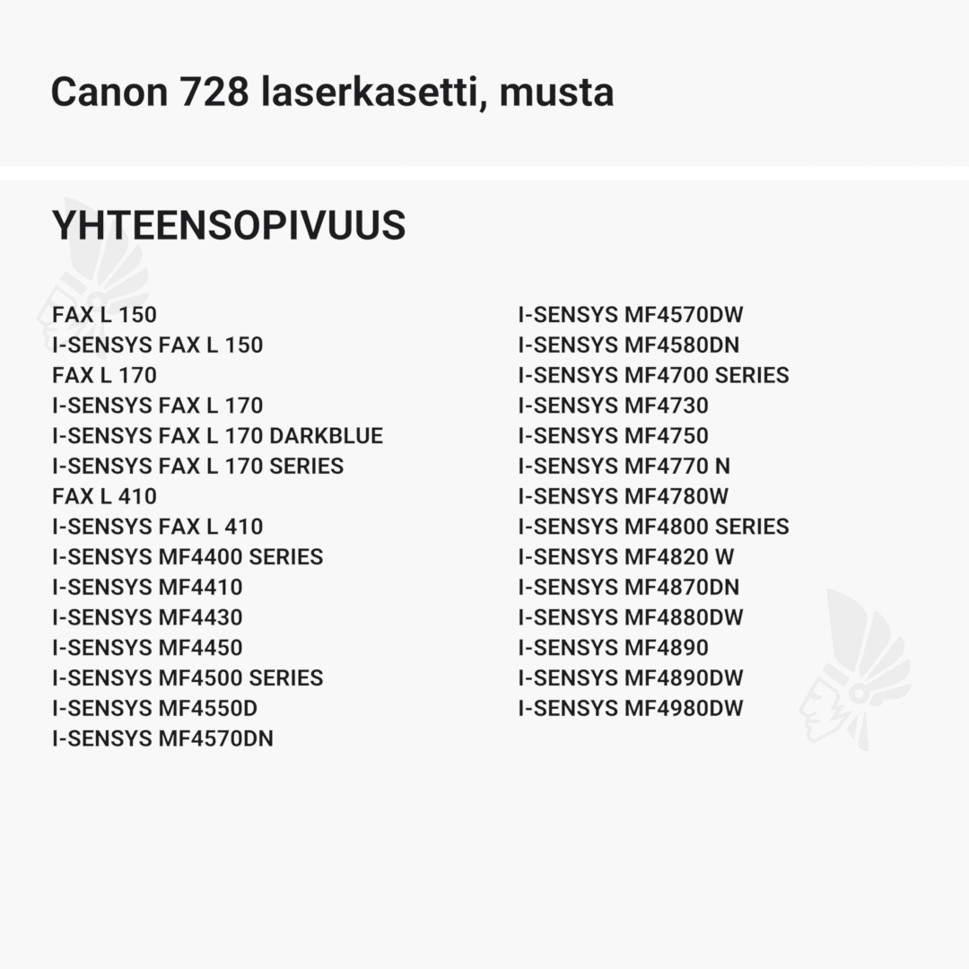 | Canon 728 laserkasetti, musta – tarvike, premium | 2100 | Väri: | Saatavuus: | 49,90 € | KORIIN |