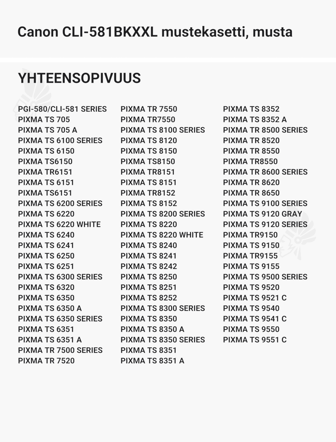 | Canon CLI-581BKXXL mustekasetti, musta – tarvike premium | 795 | Väri: | Saatavuus: | 16,90 € | KORIIN |