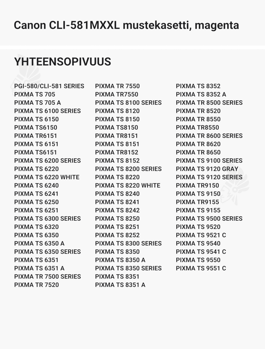 | Canon CLI-581MXXL mustekasetti, magenta – tarvike premium | 747 | Väri: | Saatavuus: | 16,90 € | KORIIN |