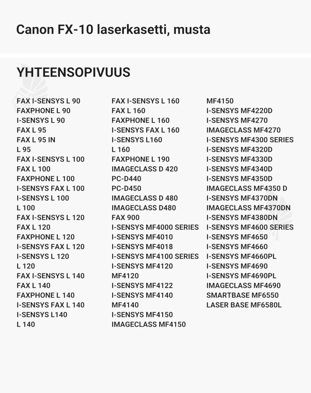 | Canon FX-10 laserkasetti, musta – tarvike, premium | 2000 | Väri: | Saatavuus: | 44,90 € | KORIIN |