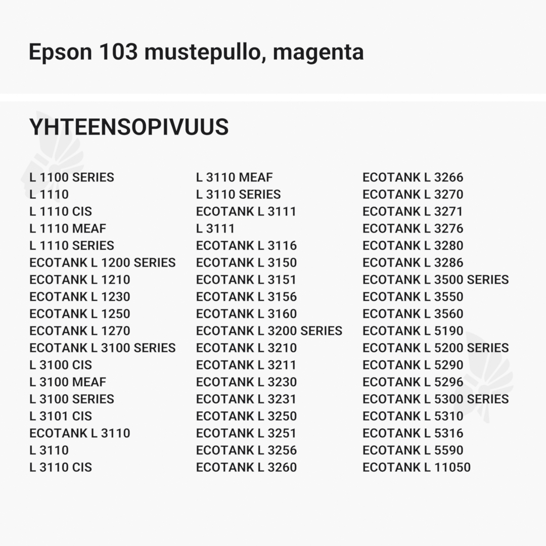 | Epson 103 mustepullo, magenta – tarvike, premium | Väri: | Saatavuus: | 9,90 € | KORIIN |
