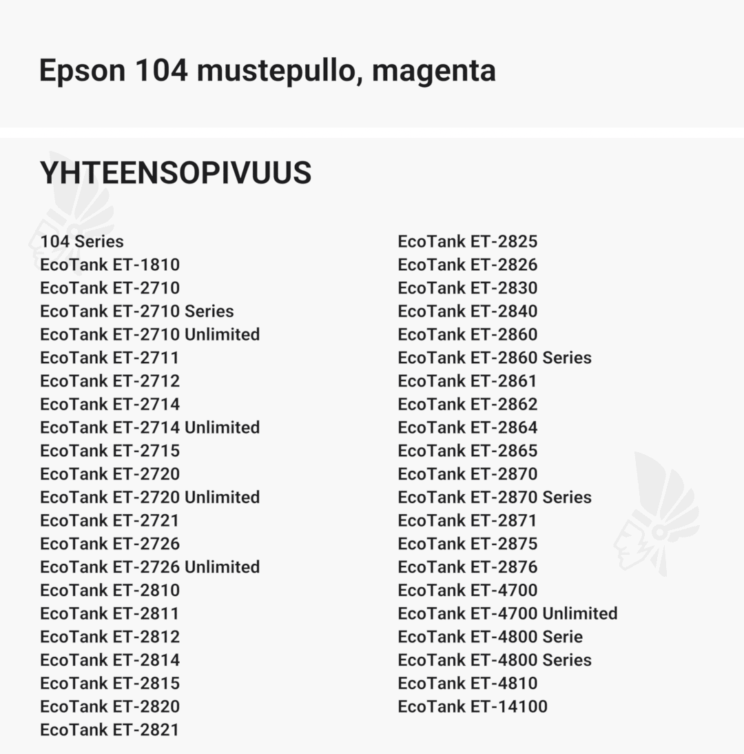 | Epson 104 mustepullo, musta – tarvike, premium | 4500 | Väri: | Saatavuus: | 9,90 € | KORIIN |
