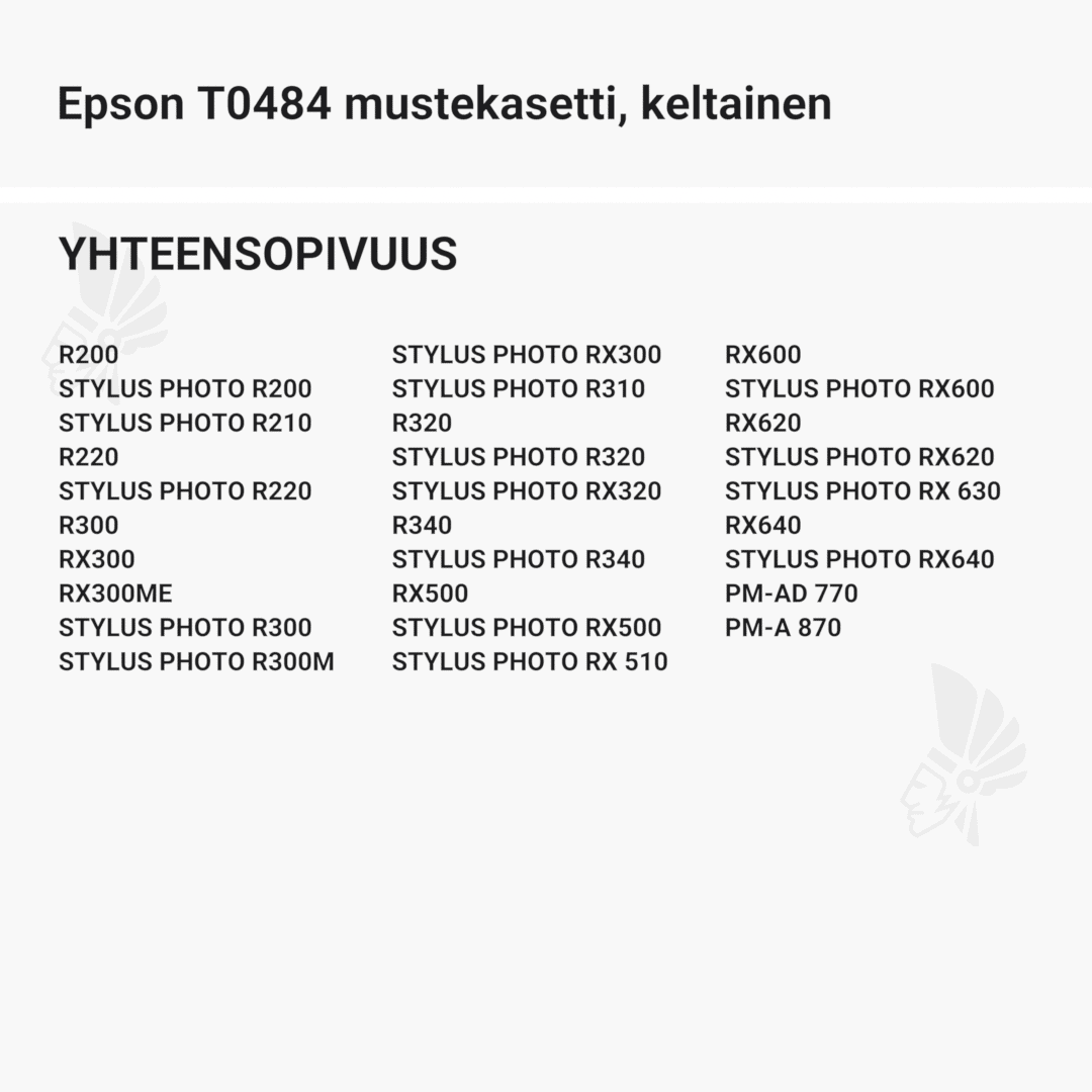 | Epson T0484 mustekasetti, keltainen – tarvike, premium | 450 | Väri: | Saatavuus: | 6,90 € | KORIIN |