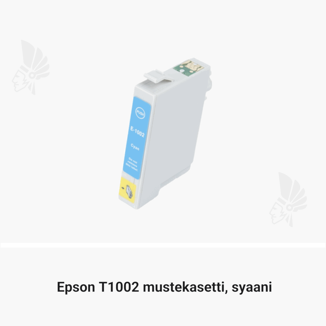 | Epson T1002 mustekasetti, syaani – tarvike, premium | 815 | Väri: | Saatavuus: | 14,90 € | KORIIN |