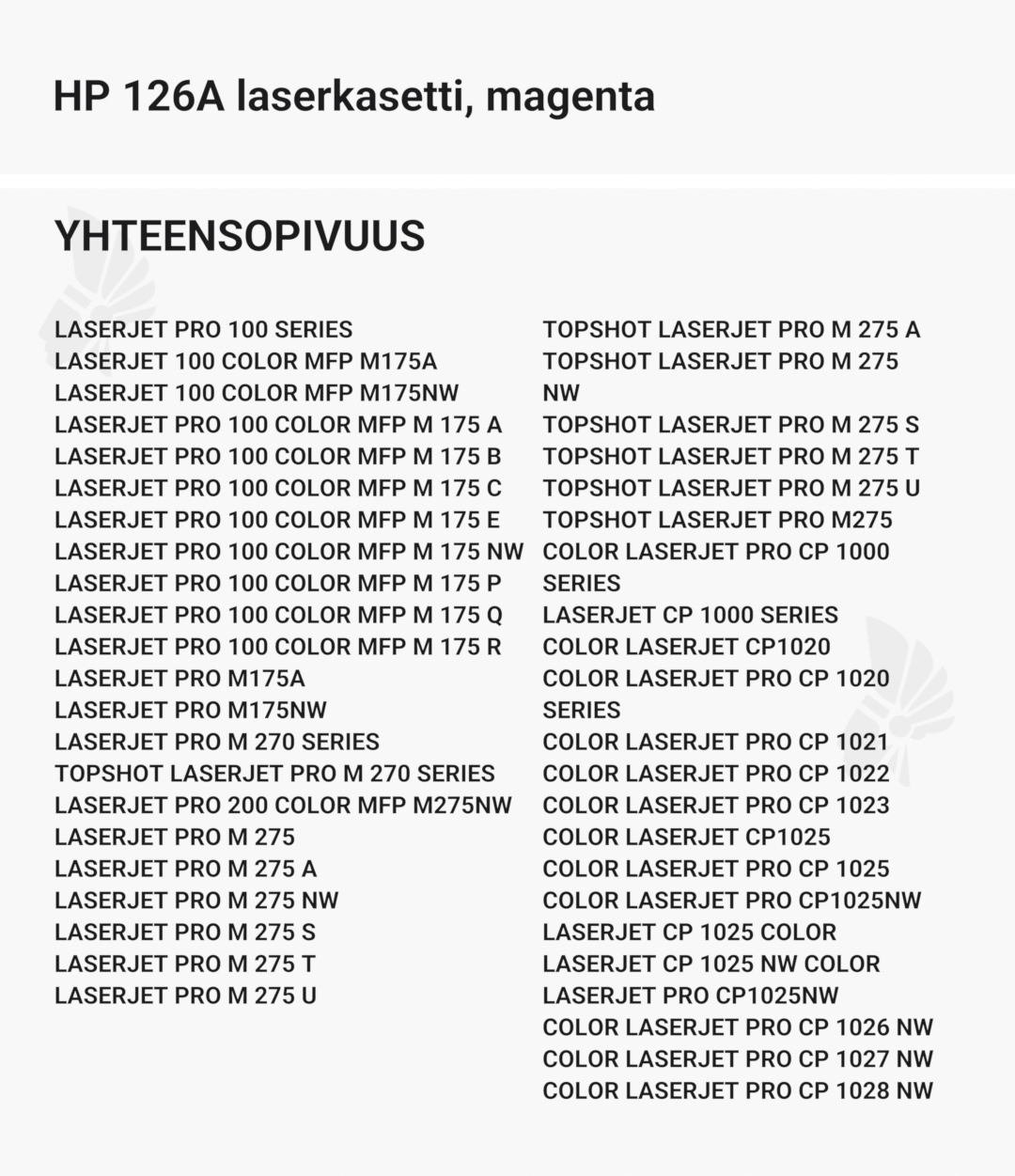 | HP 126A laserkasetti, magenta – tarvike, premium | Väri: | Saatavuus: | 32,90 € | KORIIN |
