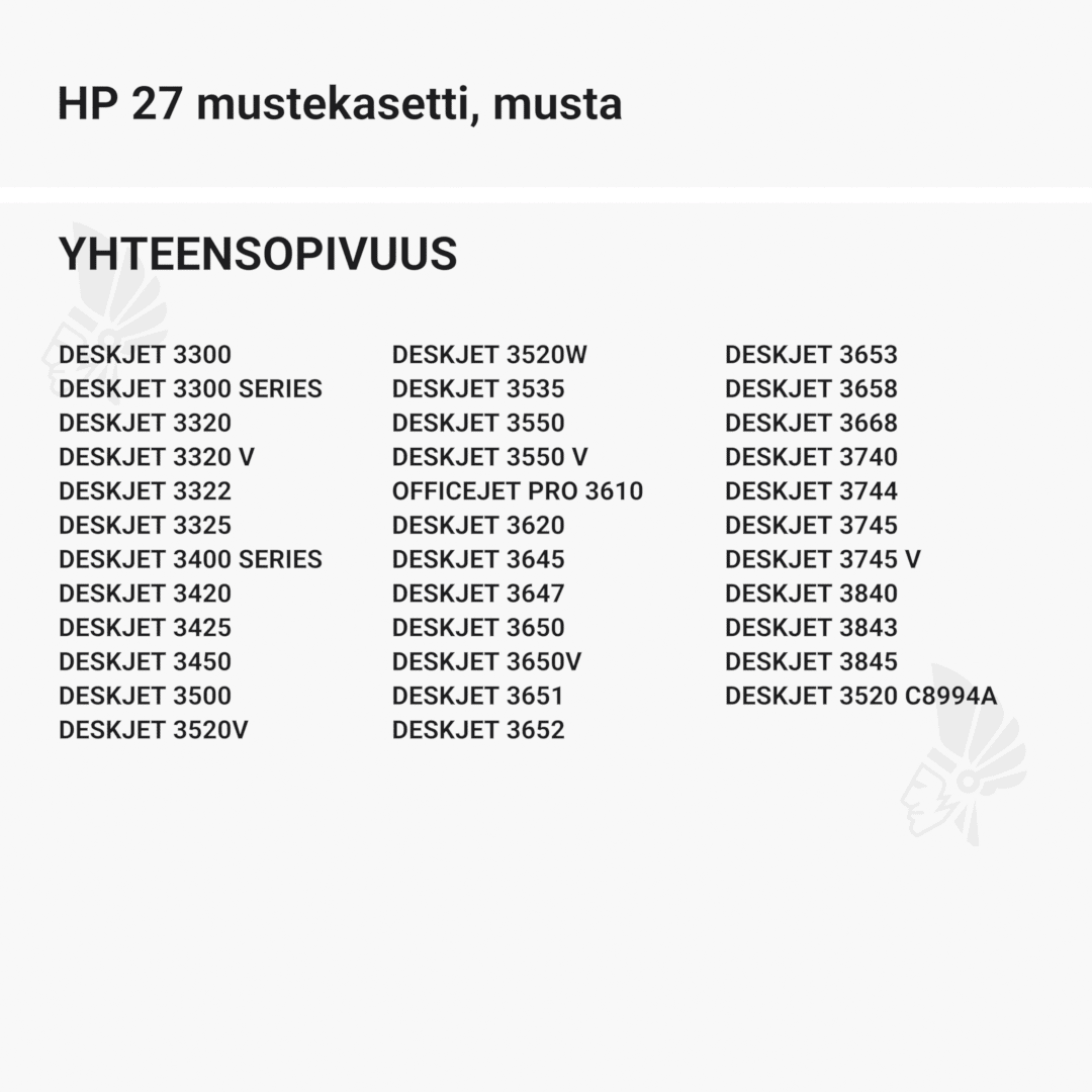 | HP 27 mustekasetti, musta – tarvike, premium | Väri: | Saatavuus: | 16,90 € | KORIIN |