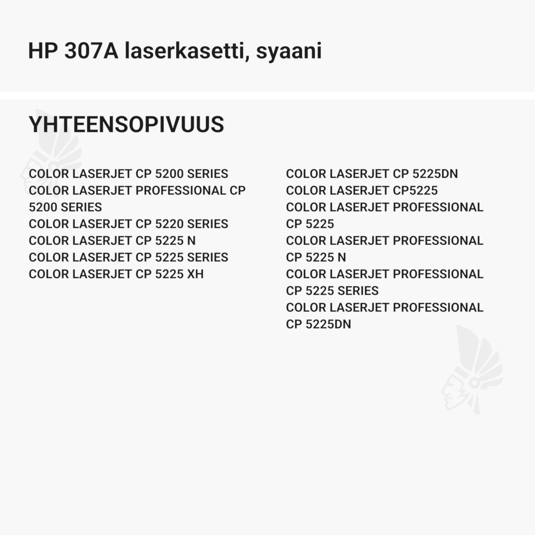 | HP 307A laserkasetti, syaani – tarvike, premium | 7300 | Väri: | Saatavuus: | 159,90 € | KORIIN |