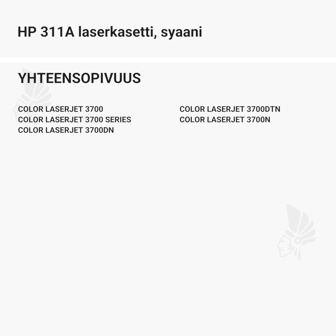| HP 311A laserkasetti, syaani – tarvike, premium | 6000 | Väri: | Saatavuus: | 132,90 € | KORIIN |