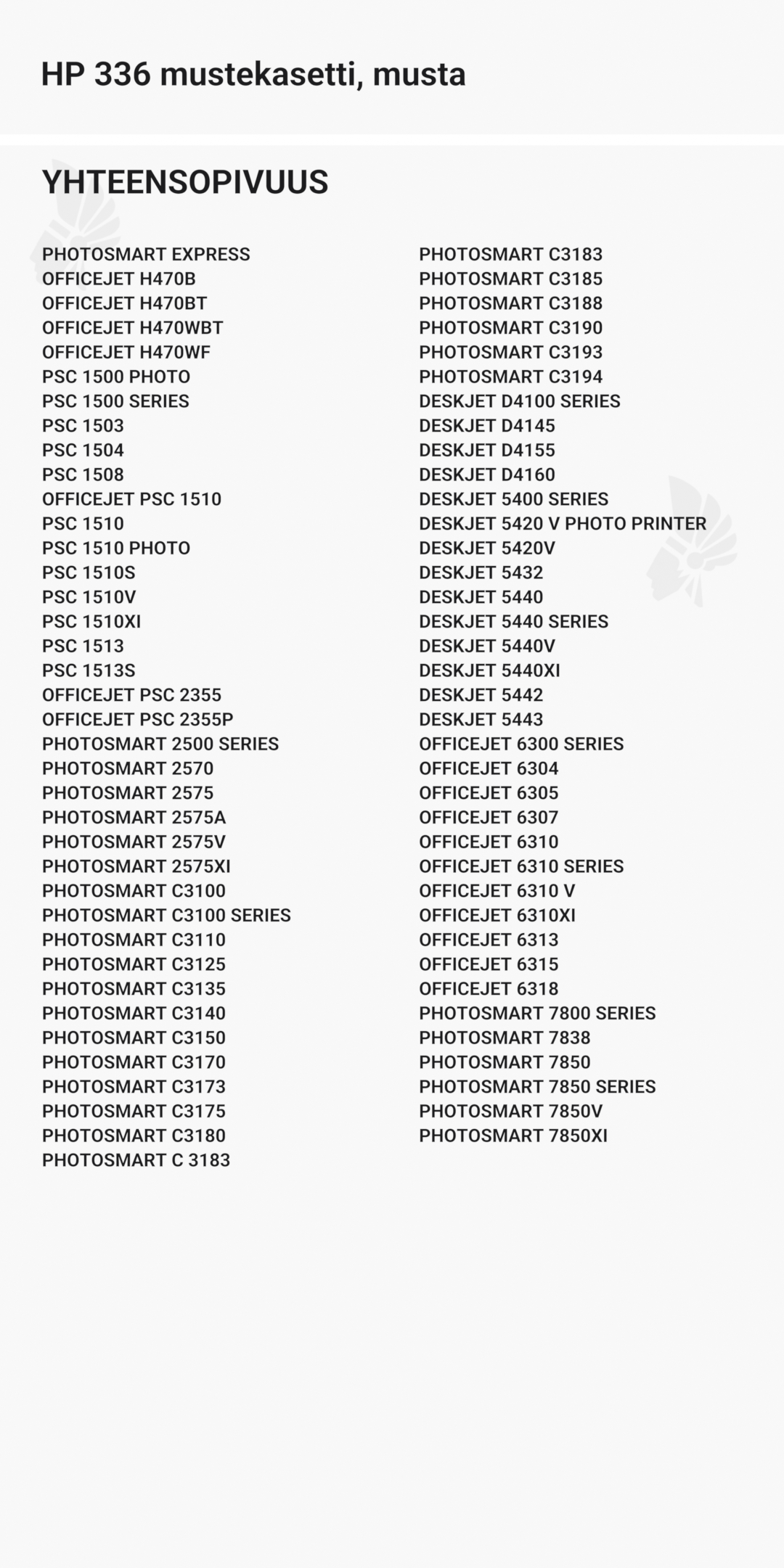 | HP 336 mustekasetti, musta – tarvike, premium | Väri: | Saatavuus: | 19,90 € | KORIIN |