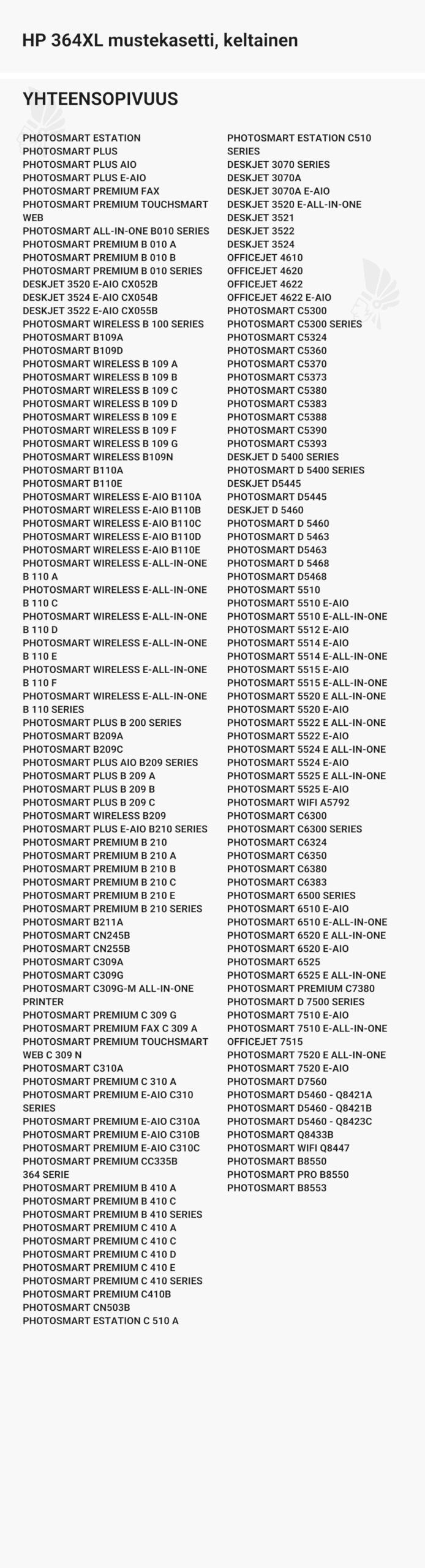 | HP 364XL mustekasetti, keltainen – tarvike, premium | 750 | Väri: | Saatavuus: | 11,90 € | KORIIN |
