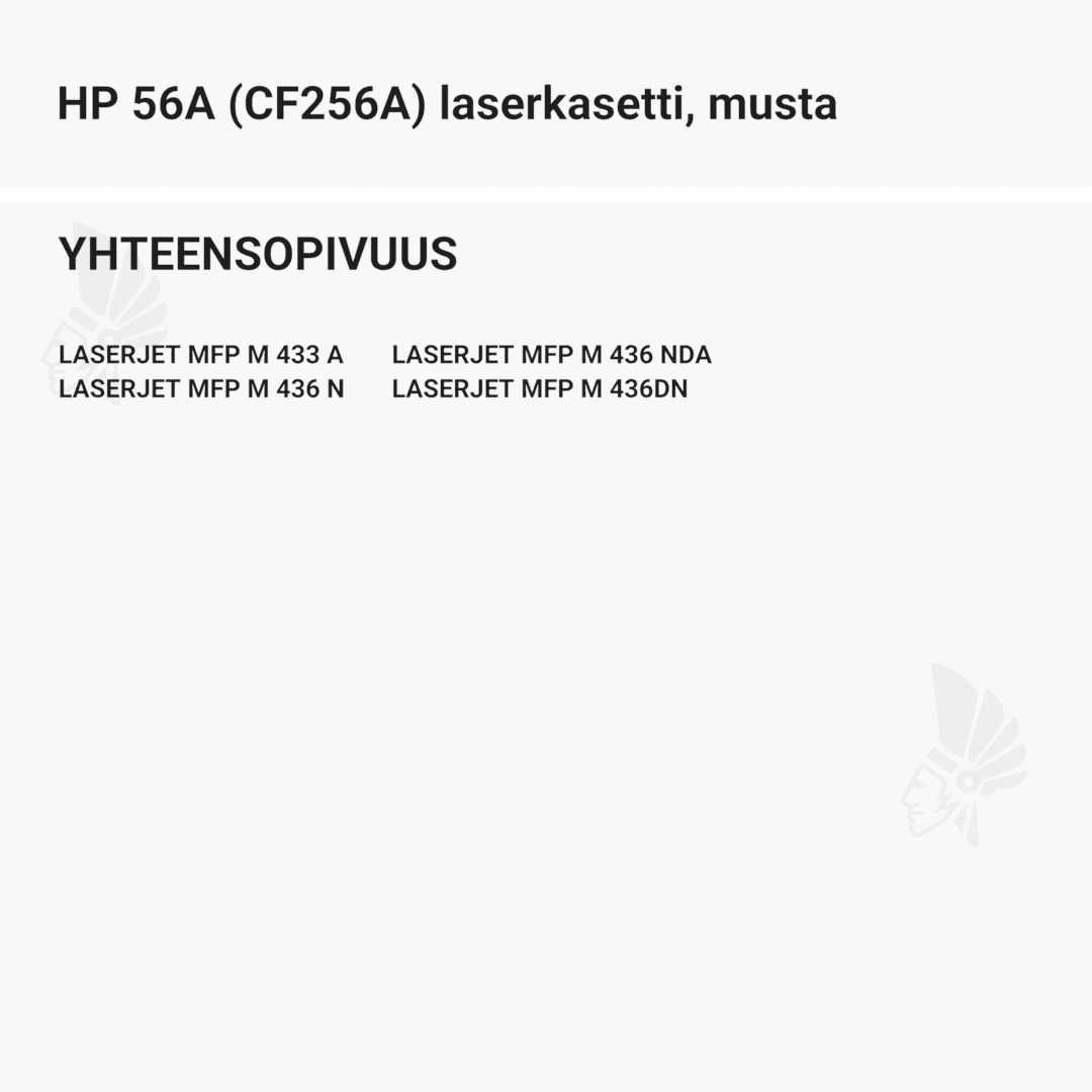 | HP 56A (CF256A) laserkasetti, musta – tarvike, premium | 7400 | Väri: | Saatavuus: | 99,90 € | KORIIN |