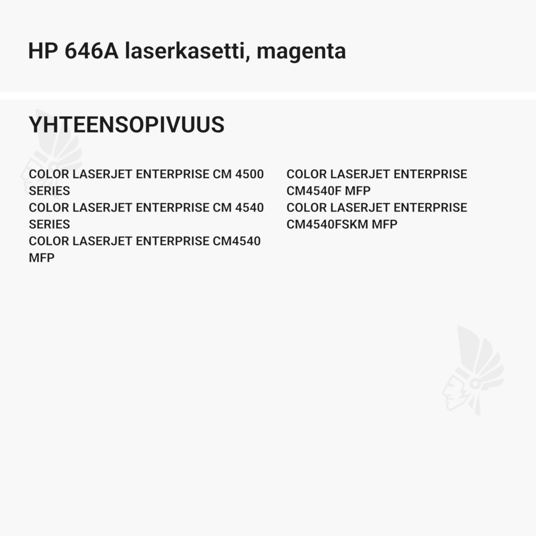 | HP 646A laserkasetti, magenta – tarvike, premium | 12500 | Väri: | Saatavuus: | 99,90 € | KORIIN |