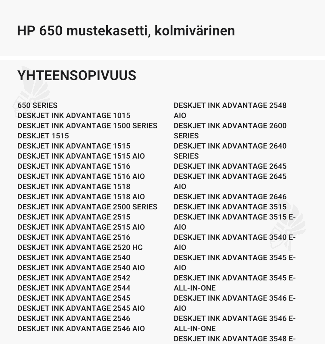 | HP 650 mustekasetti, kolmivärinen – tarvike, premium | Väri: | Saatavuus: | 22,90 € | KORIIN |