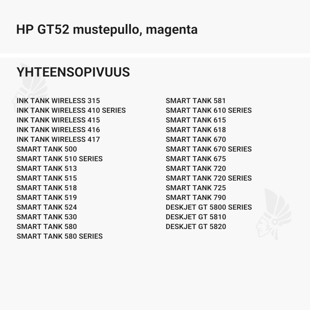 | HP GT52 mustepullo, magenta – tarvike, premium | Väri: | Saatavuus: | 9,90 € | KORIIN | |