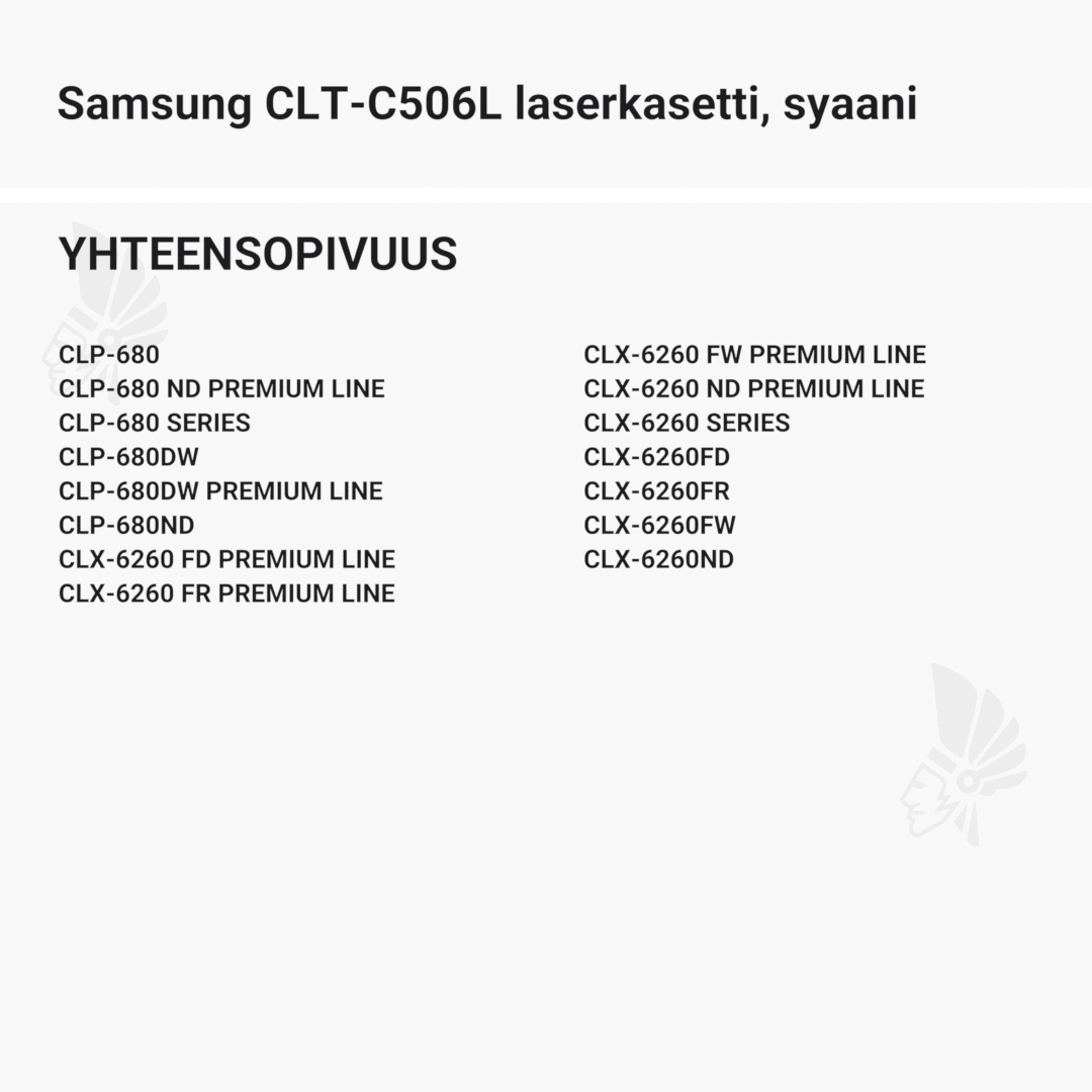 | Samsung CLT-C506L laserkasetti, syaani – tarvike, premium | 3500 | Väri: | Saatavuus: | 69,90 € | KORIIN |